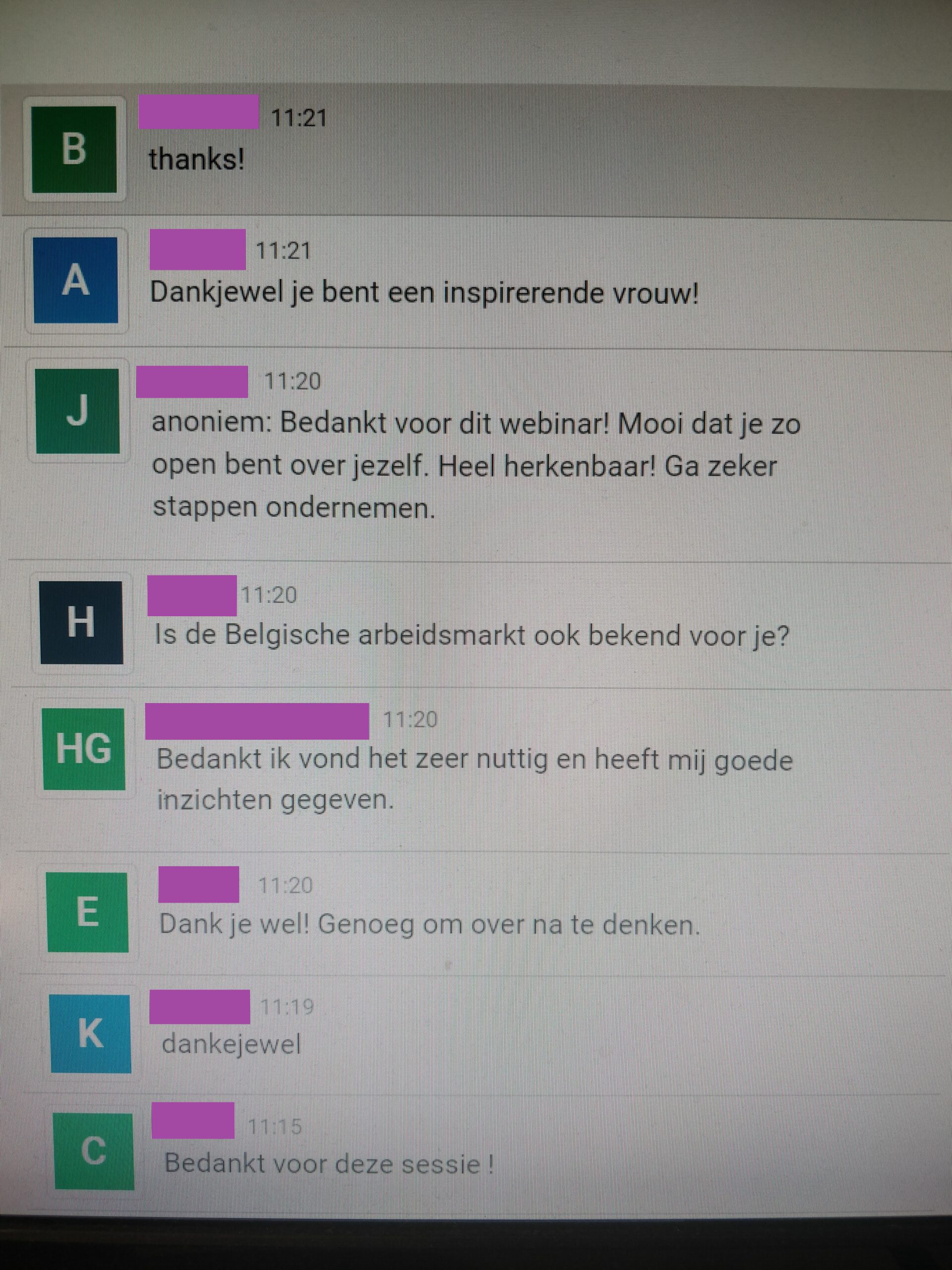 Ik heb de webinar als ´’to the point´’ ervaren. Daar houd ik wel van. Ik kan mij echt vinden in de voorbeelden. Alles is zo herkenbaar pff… Ik vond het duidelijk, positief en leerzaam. Dankjewel
